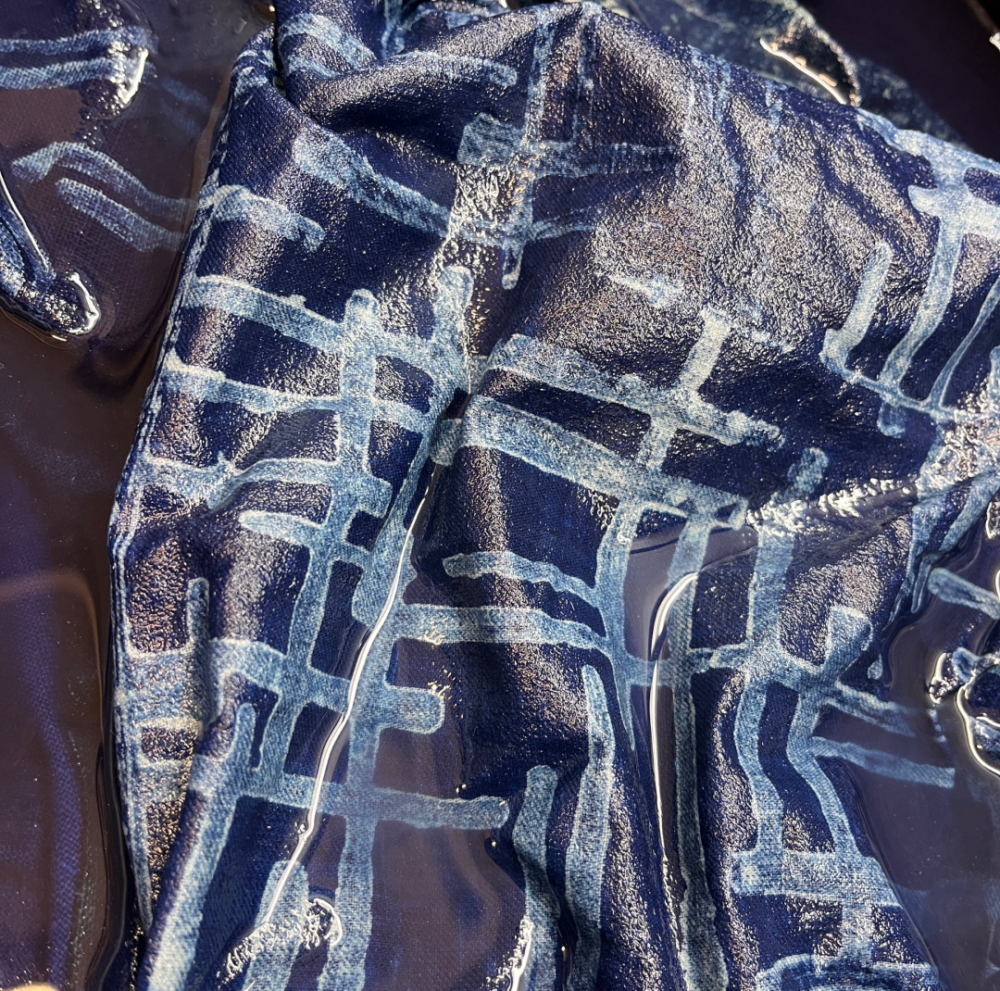 Es ist eine abstrakte Erzählung, die zwischen jahrhundertealter Tradition und Gegenwart sowie zwischen Erinnerung an den hier verübten Femizid und Widerstand gegen Tradiertes pendelt. Sie greifen dafür auf die Technik des Blaudrucks zurück, die seit 2018 Immaterielles Weltkulturerbe ist, und interpretieren das Handwerk zeitgenössisch.